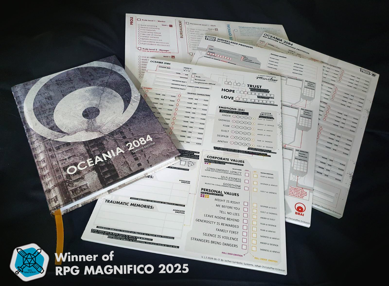 "Oceania 2084 provides a masterful tabletop game design for confronting abstract concepts of truth, manipulation of beliefs and agency."